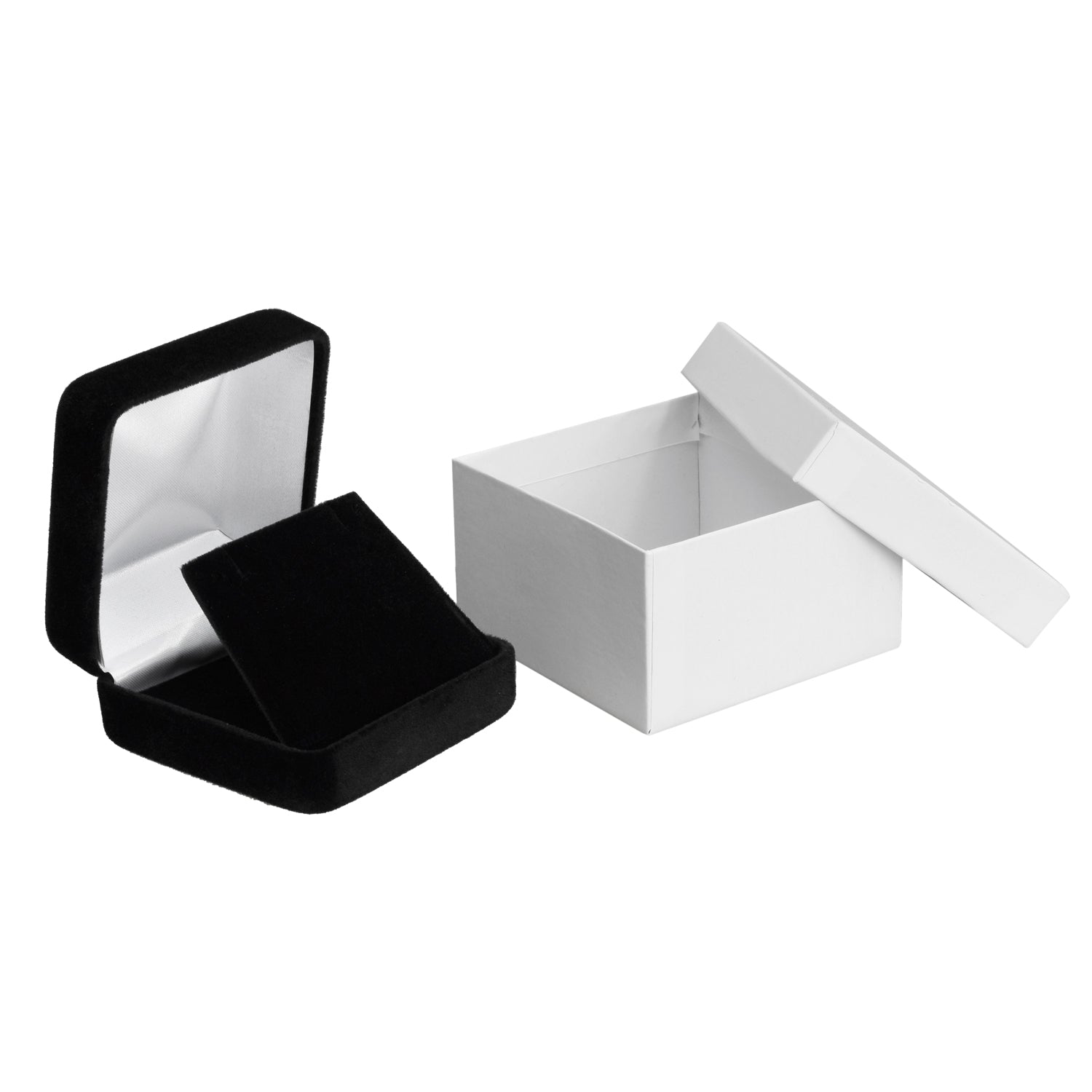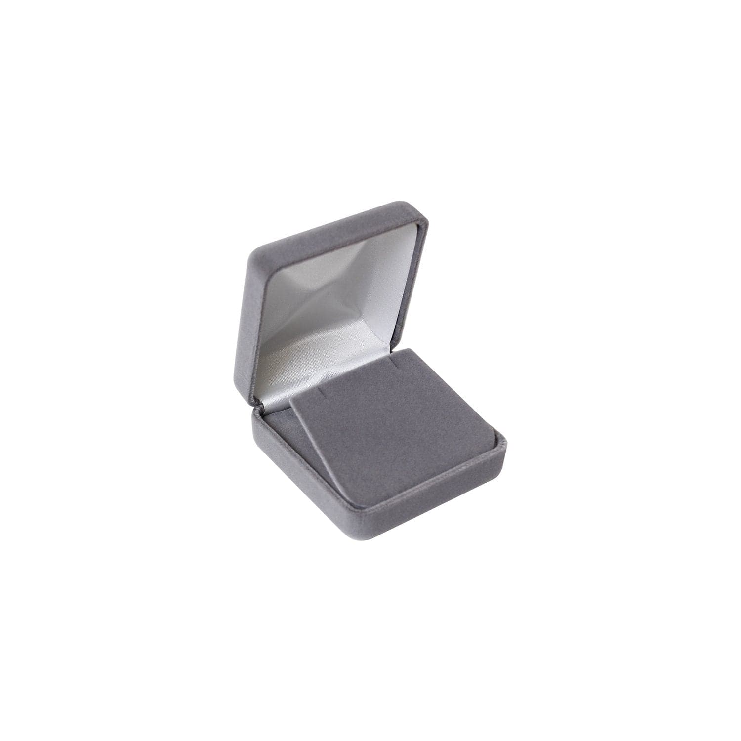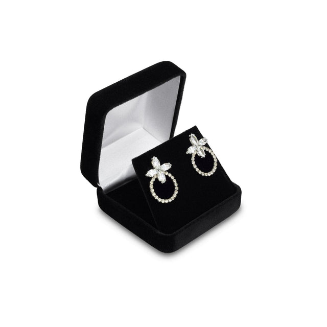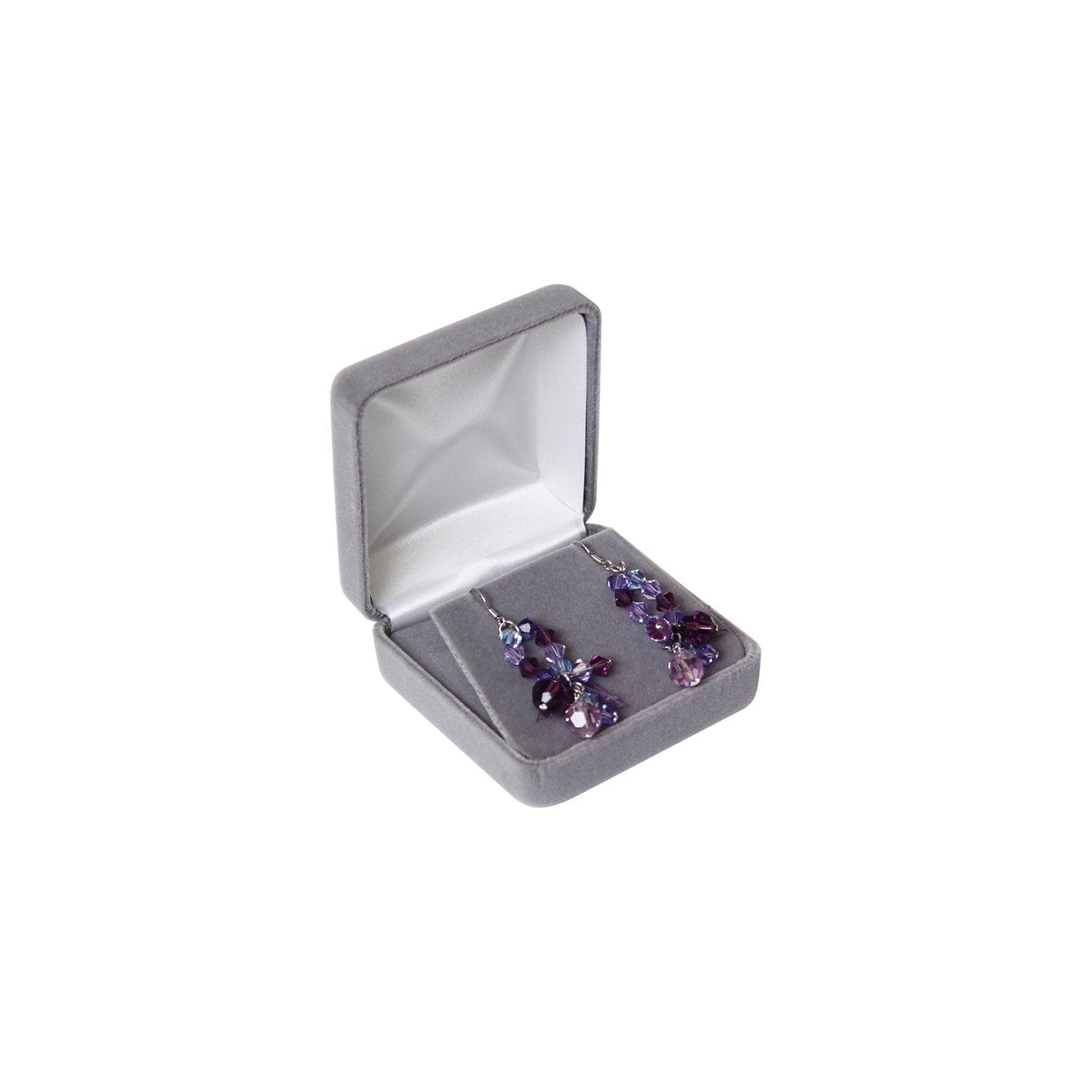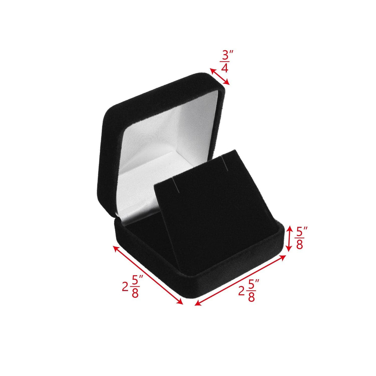 This earring/pendant box with a metal frame is covered with velvet and has a white satin interior. It contains an earring/pendant insert with two slots covered in velvet. Each box includes a white two-piece packer.