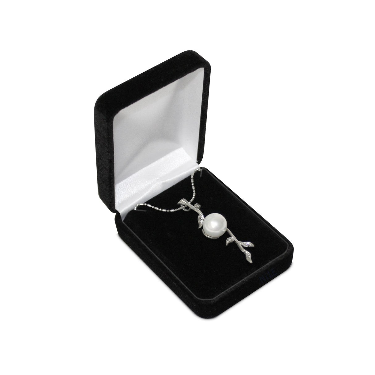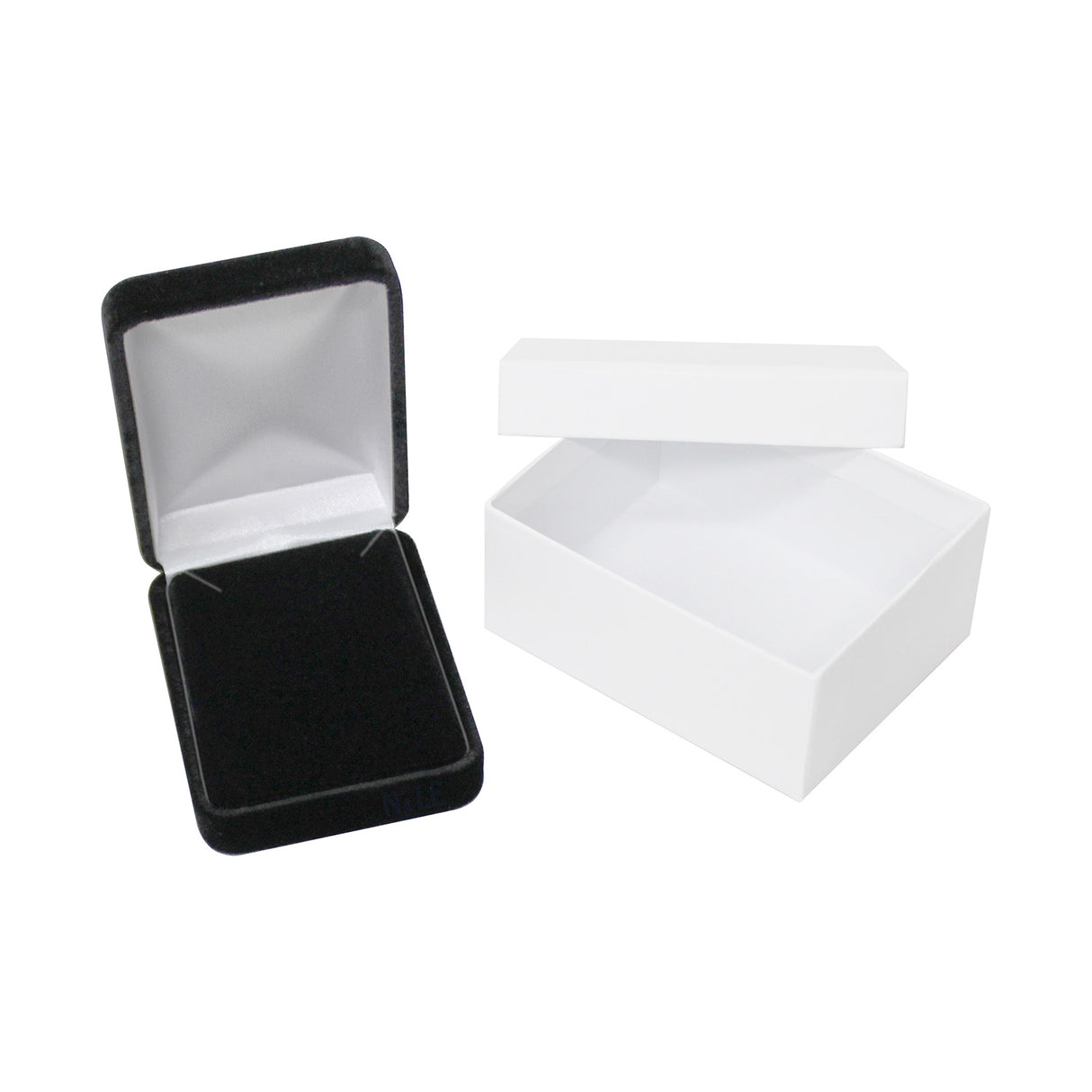 This earring and necklace box has a metal frame with a velvet exterior. The interior is lined with white satin and contains a flocked velvet insert with a pair of earring holes and slots for a necklace. Each box includes a white two piece packer.- VELVET EARRING AND NECKLACE BOX - It has a metal frame with rich velvet finish and inserts.