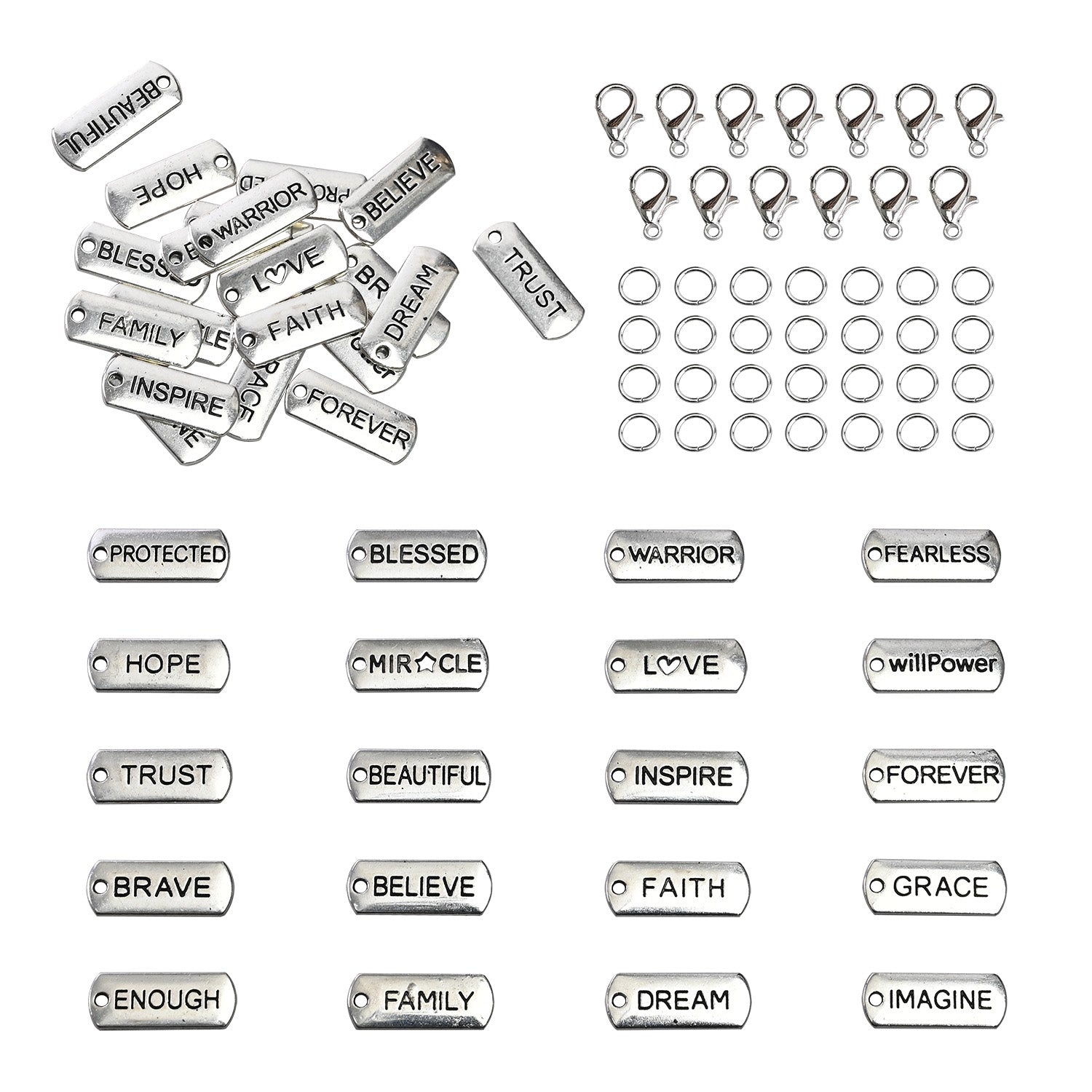 #LD97343 100pcs Craft Supplies Handmade Assorted Antique Silver Inspiration Text Dangle Charms Pendant with Lobster Clasp,Open Ring for Jewelry Making Accessory is backordered and will ship as soon as it is back in stock.