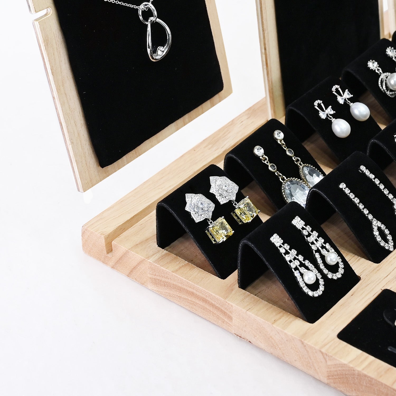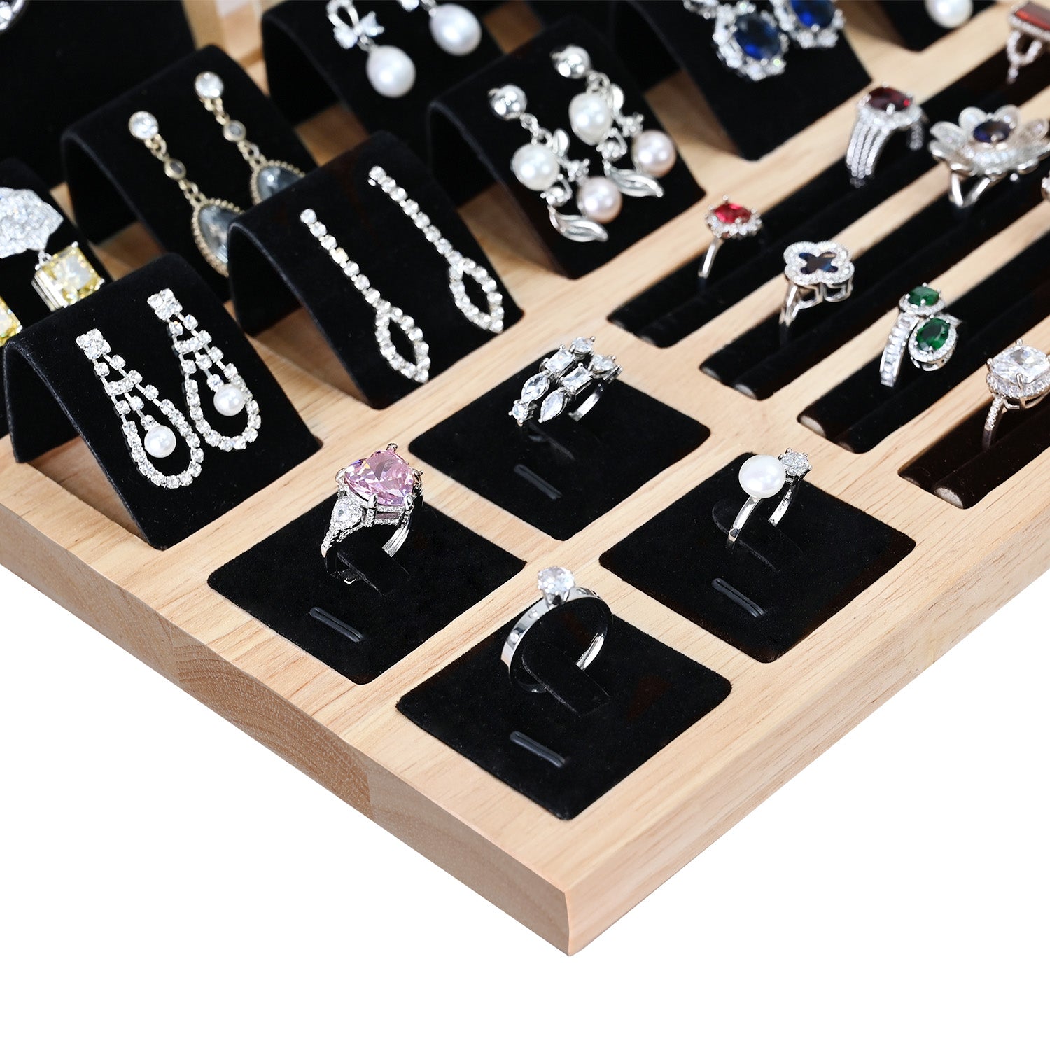Versatile Solid Wood Jewelry Display Stand—perfect for showcasing rings, earrings, bracelets, and more. It includes utility hooks for pendants and earrings and features a natural wood design with black or white faux leather trim. The stand is removable, making it convenient for storage and travel.