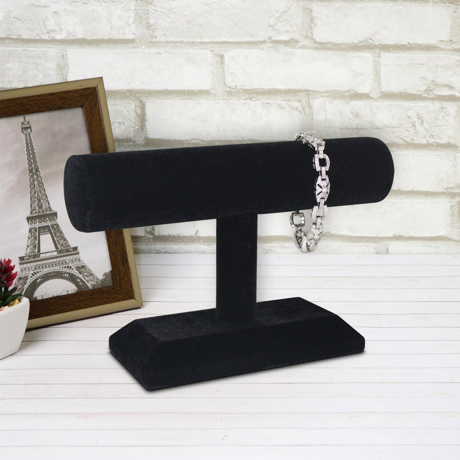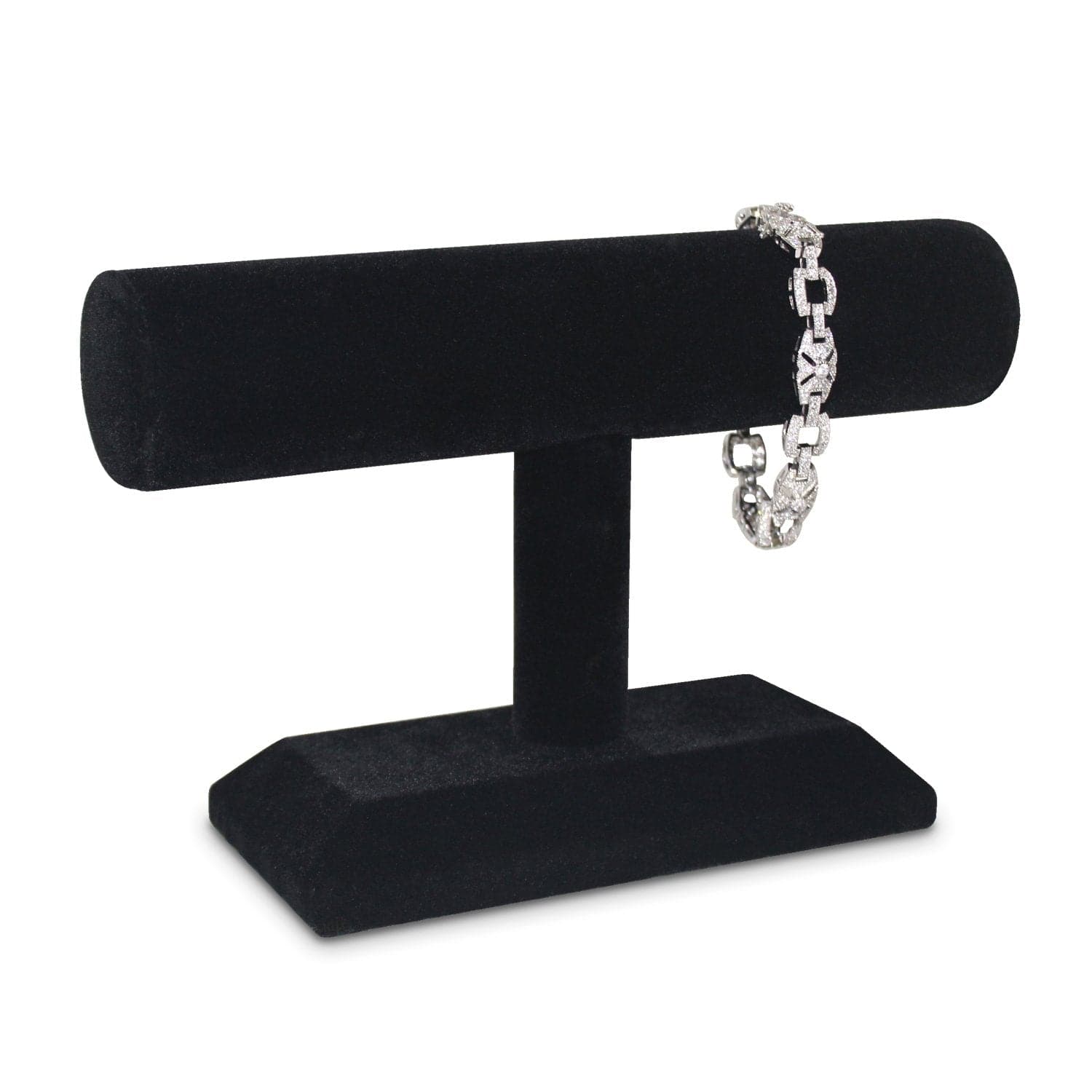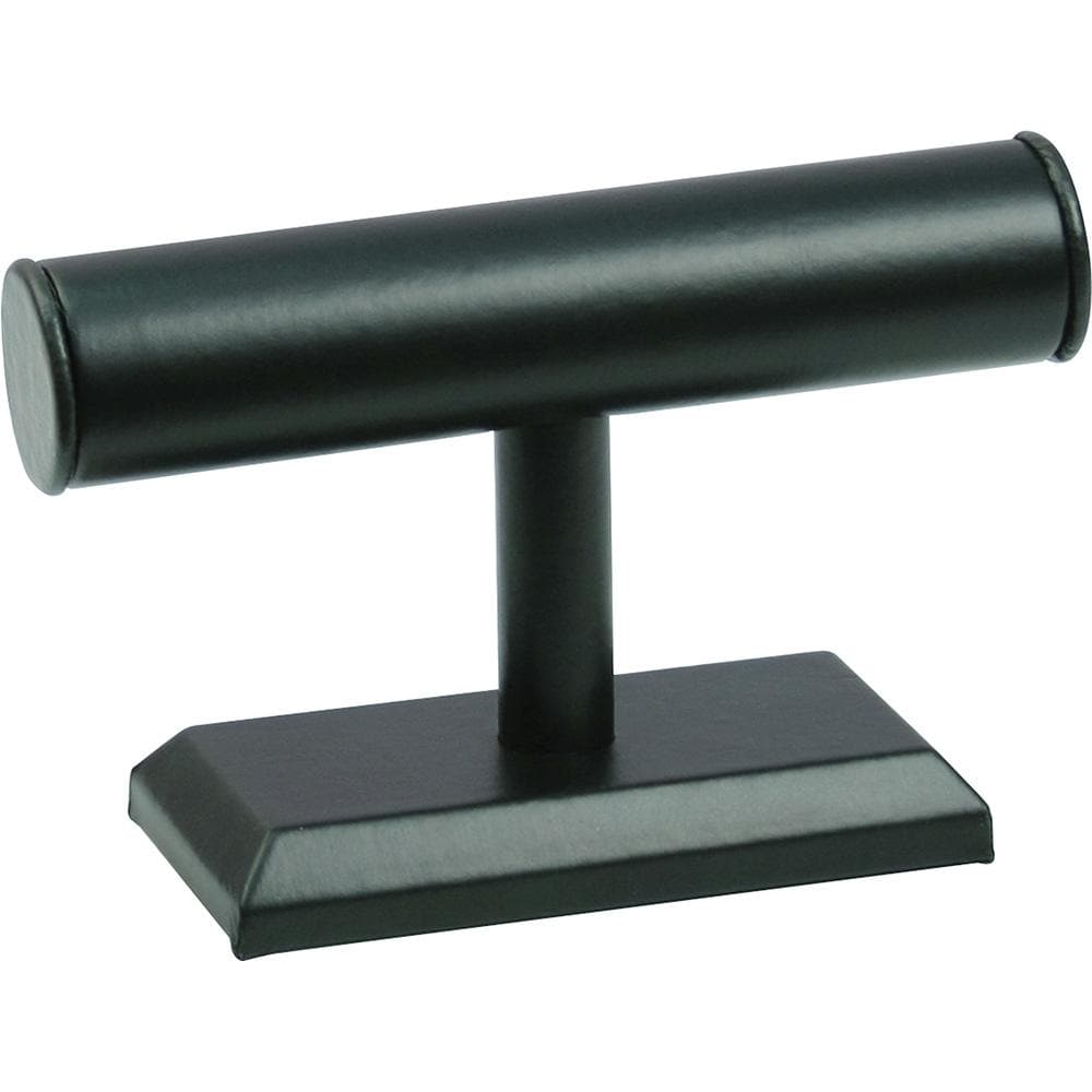 Store your bracelets and watches with this classic single T-bar (7 1/2"W x 1 1/2" diameter) display. It is made of wood covered with white leatherette or soft black velvet. Jewelry not included