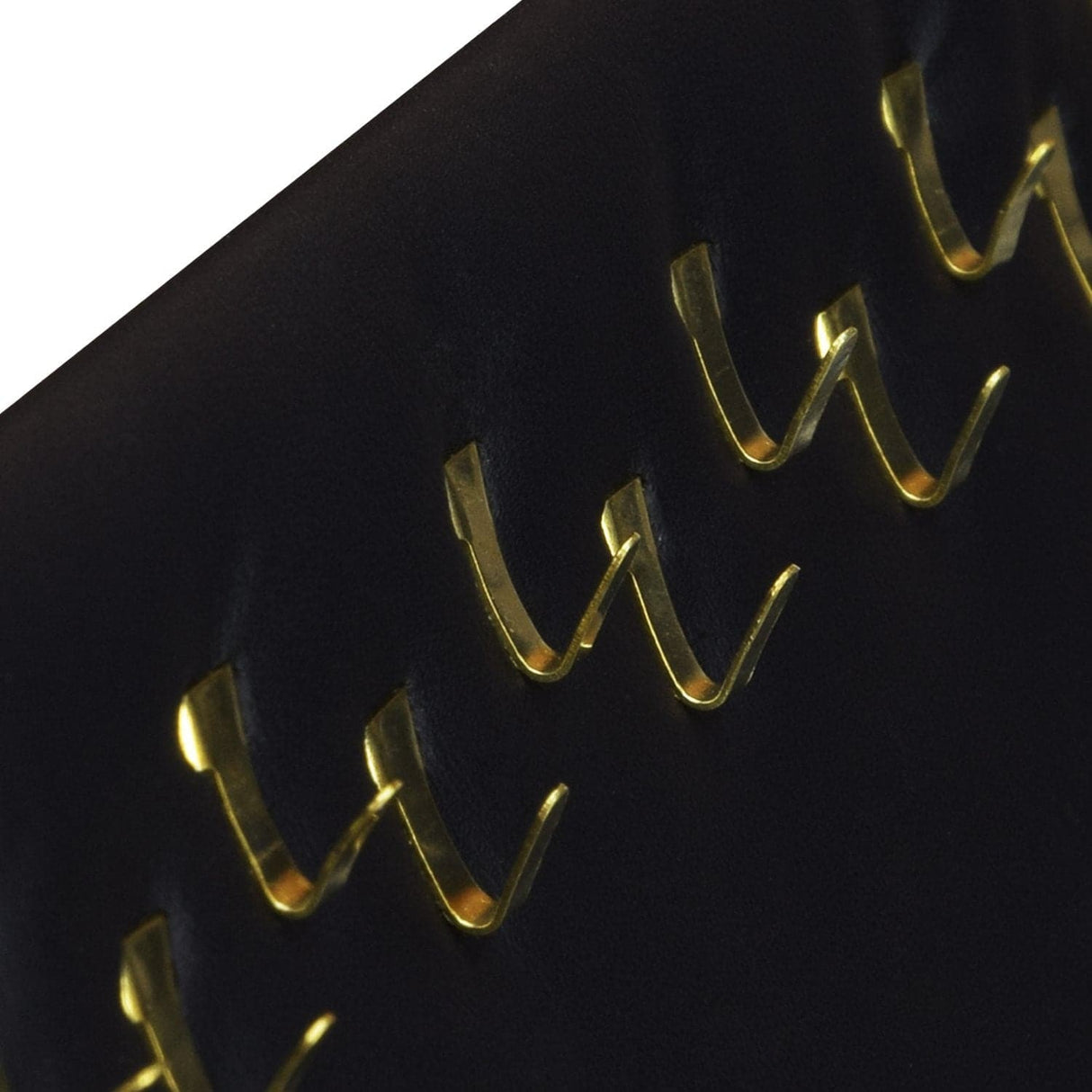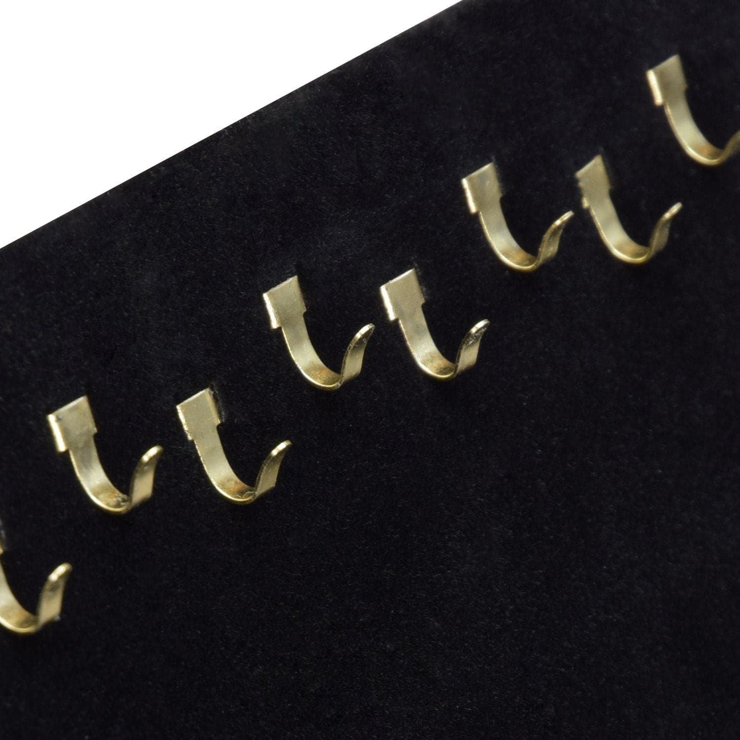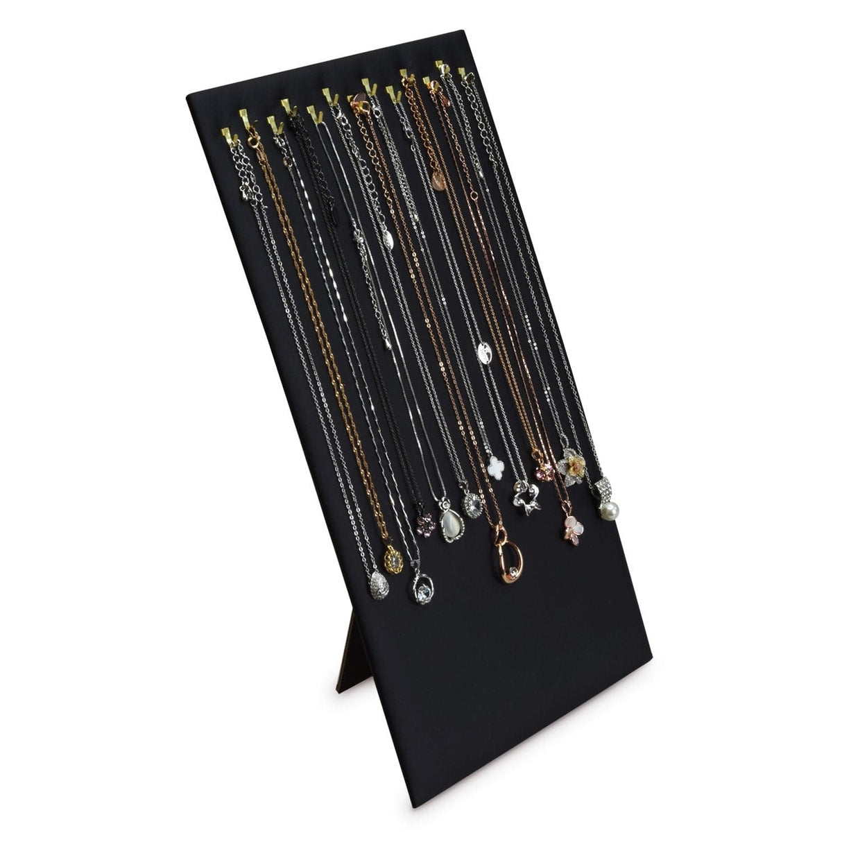 Display up to thirteen necklaces or chains with this easel display pad. It is made of wood covered in black velvet or white leatherette with a sturdy cardboard easel on the back. It has 13 metal hooks that are staggered along the top of the pad to make setup quick and easy. The display is suitable for thin necklaces or chains and makes a great stand for countertops or special events. Jewelry not included.