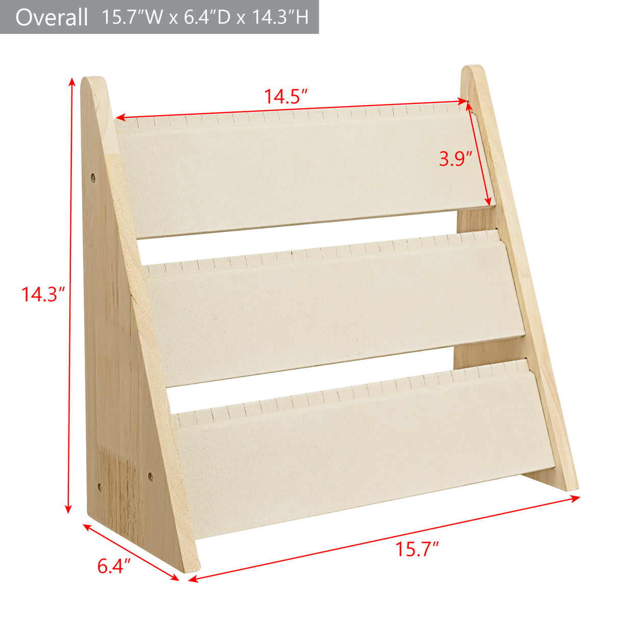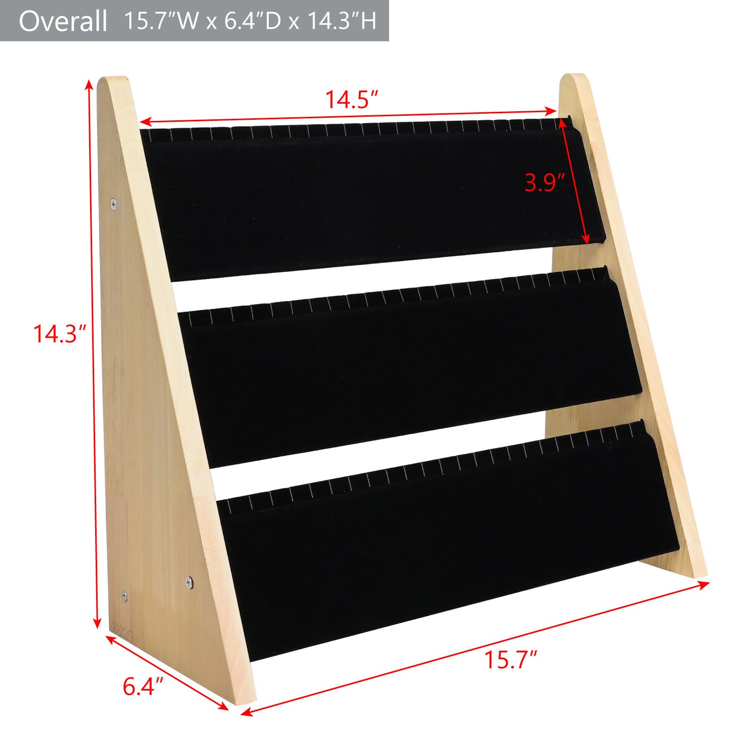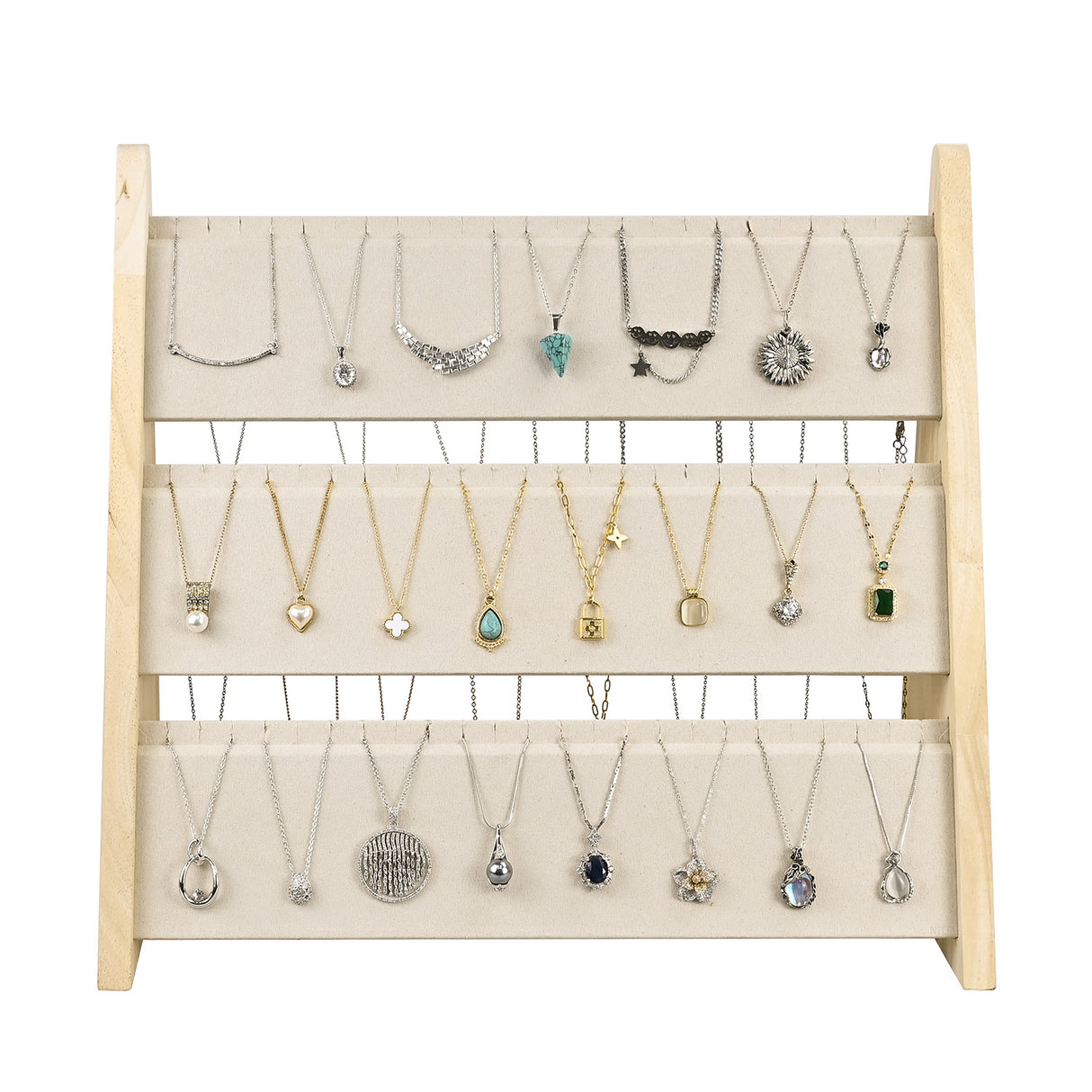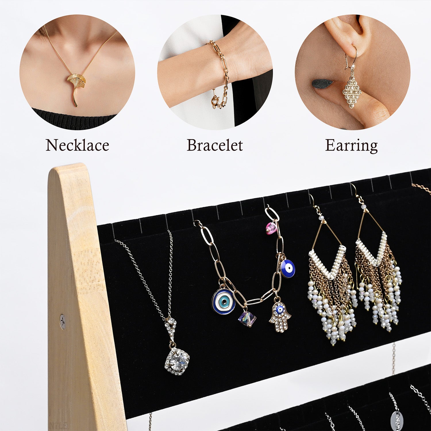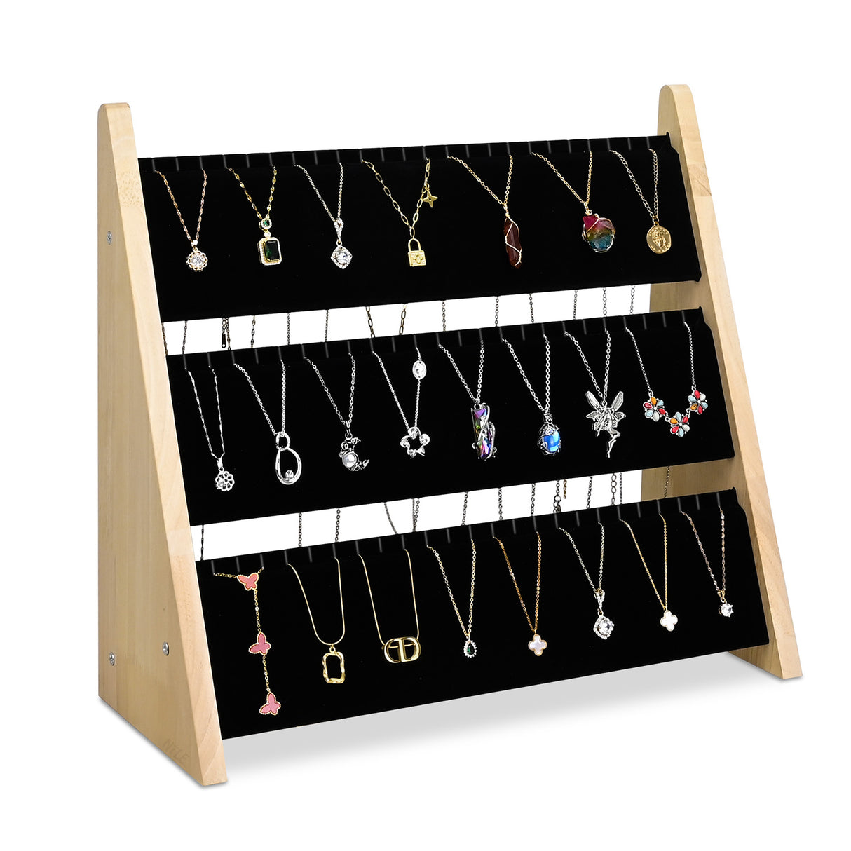 Display and store your necklaces and bracelets with ease using our high-quality wooden and velvet jewelry rack! With 3 tiers, you'll never have to worry about tangled jewelry again. Find what you need quickly and effortlessly on our display stand. Order now and elevate your jewelry organization game!