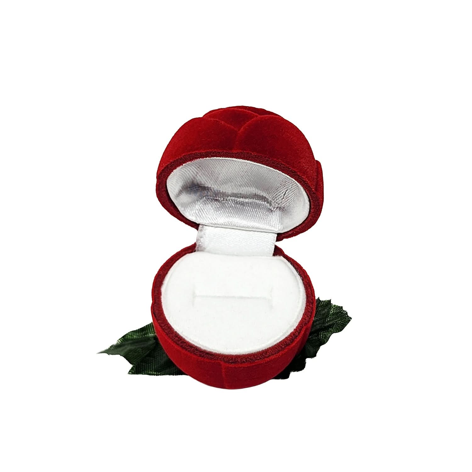 Flocked Velvet Red Rose Ring Box with white flocked-foam inserts and satin-lined lids.