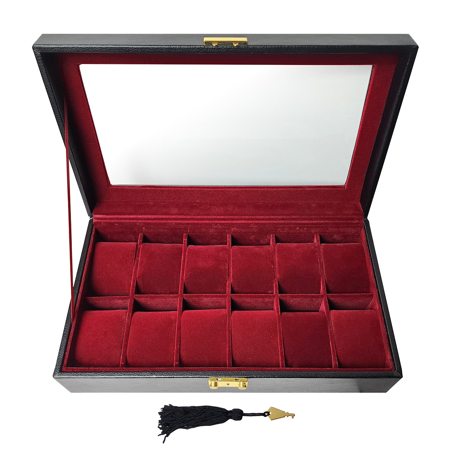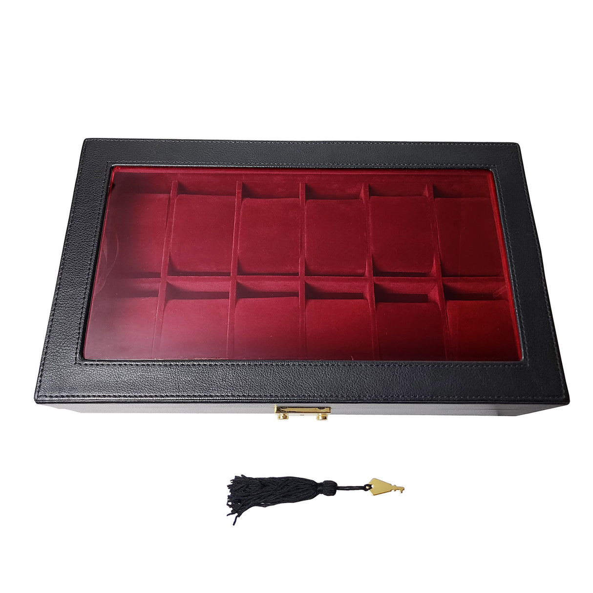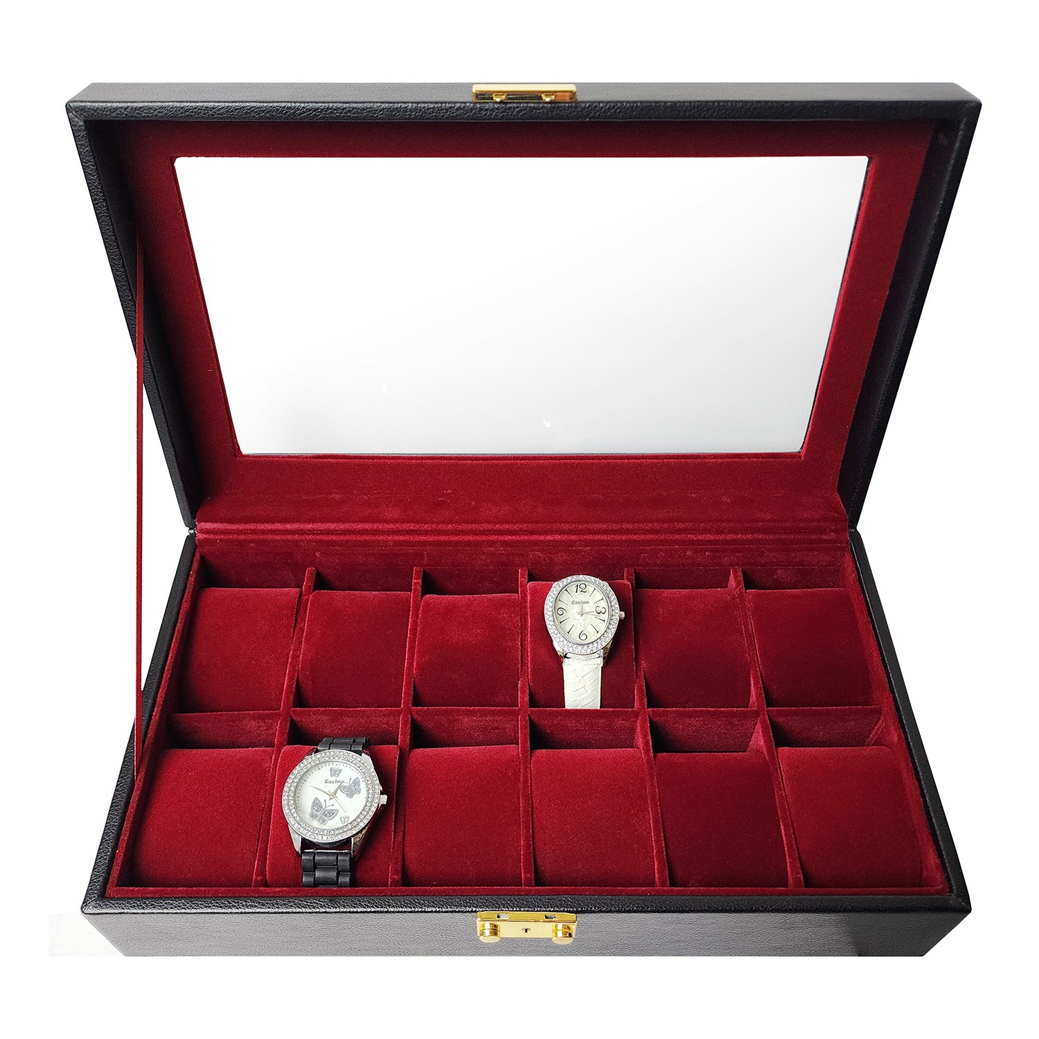 Store, organize, and display your watch collection securely with this leatherette watch case. It is made of MDF wood and includes 12 individual burgundy velvet cushions.