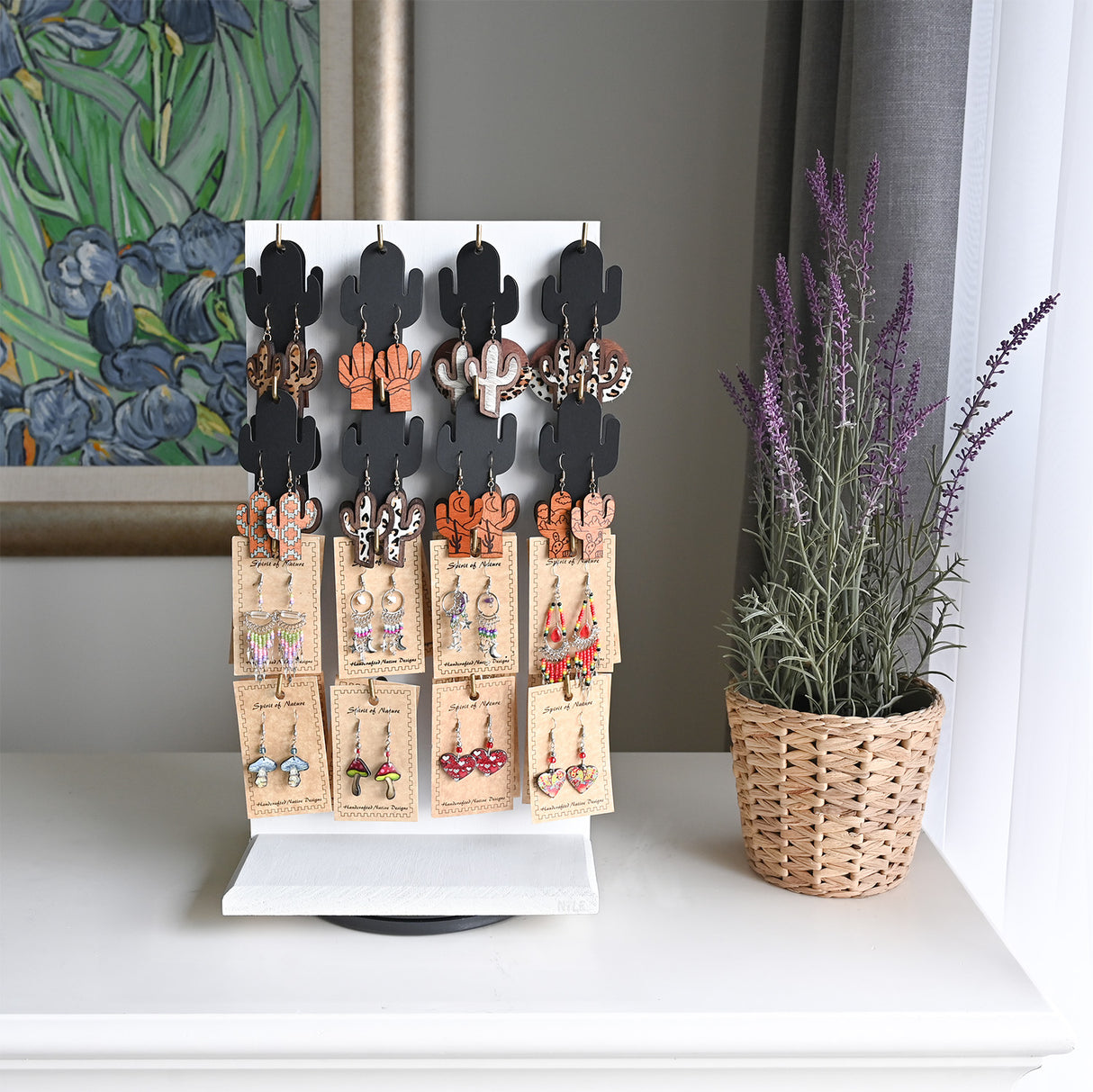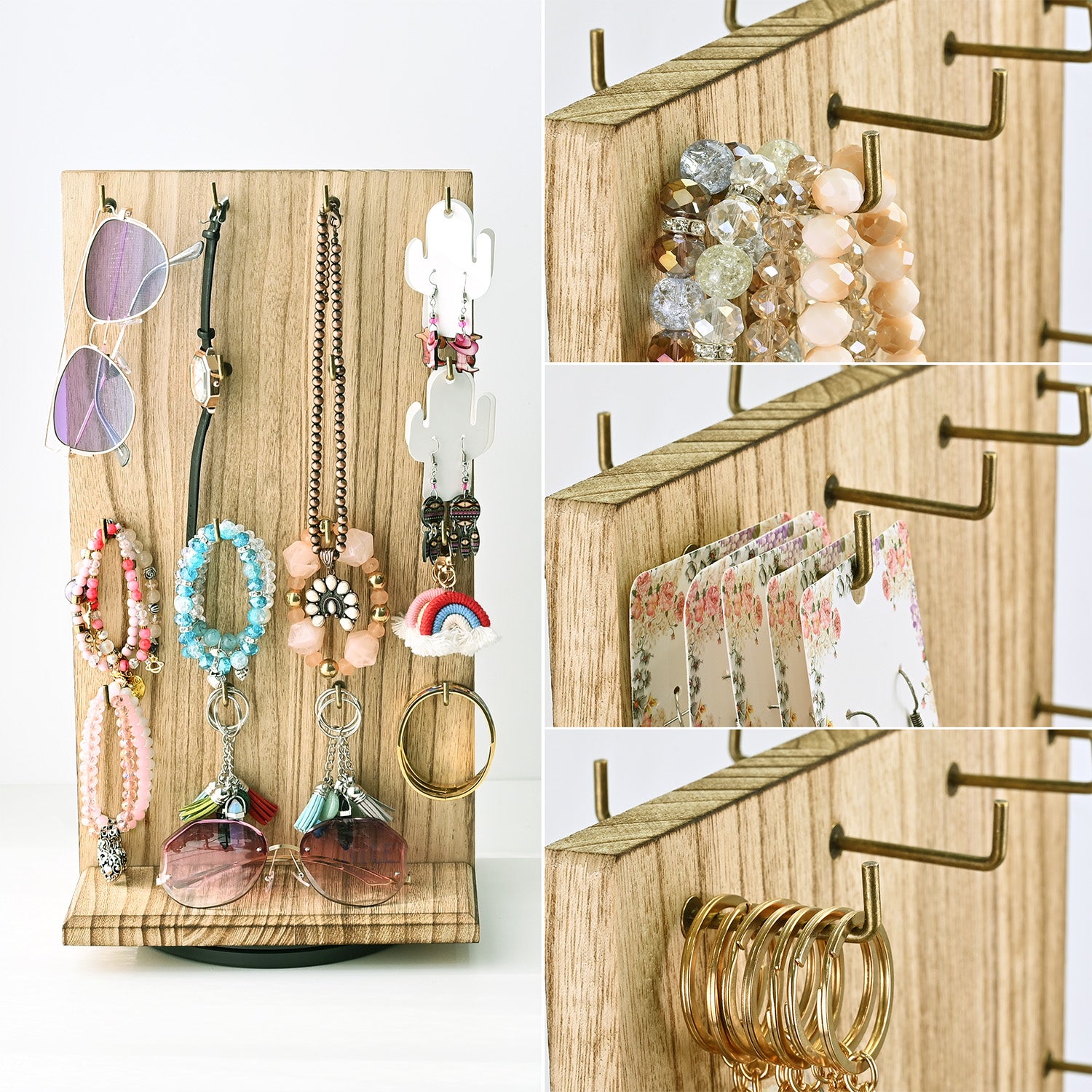 - ROTATING WOODEN JEWELRY DISPLAY - This jewelry holder sits on a rotating stand, which is more radiant than a regular one. It can display various types of earrings and necklaces.
