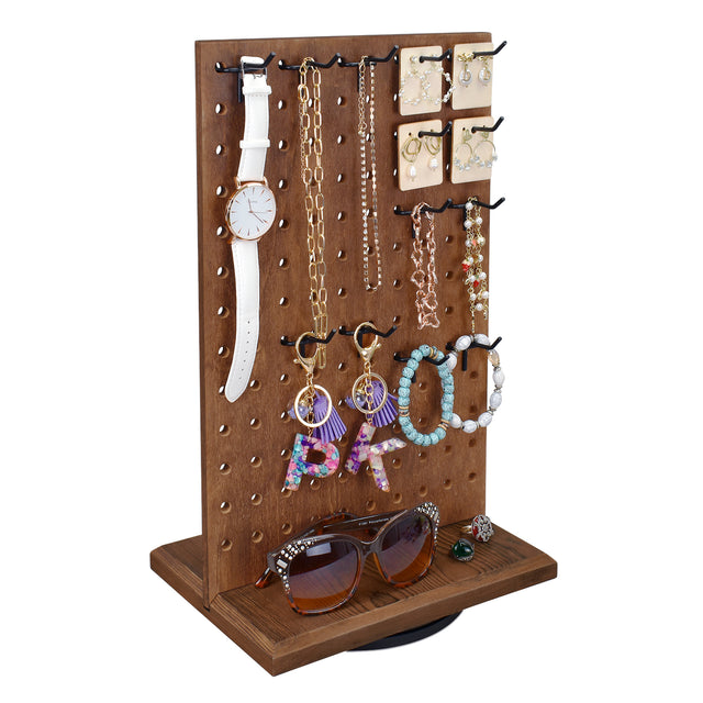 #WDJ6330BR Wooden Rotating Two-Sided Pegboard Jewelry Display Stand with 30 Removable Hooks, Brown Color