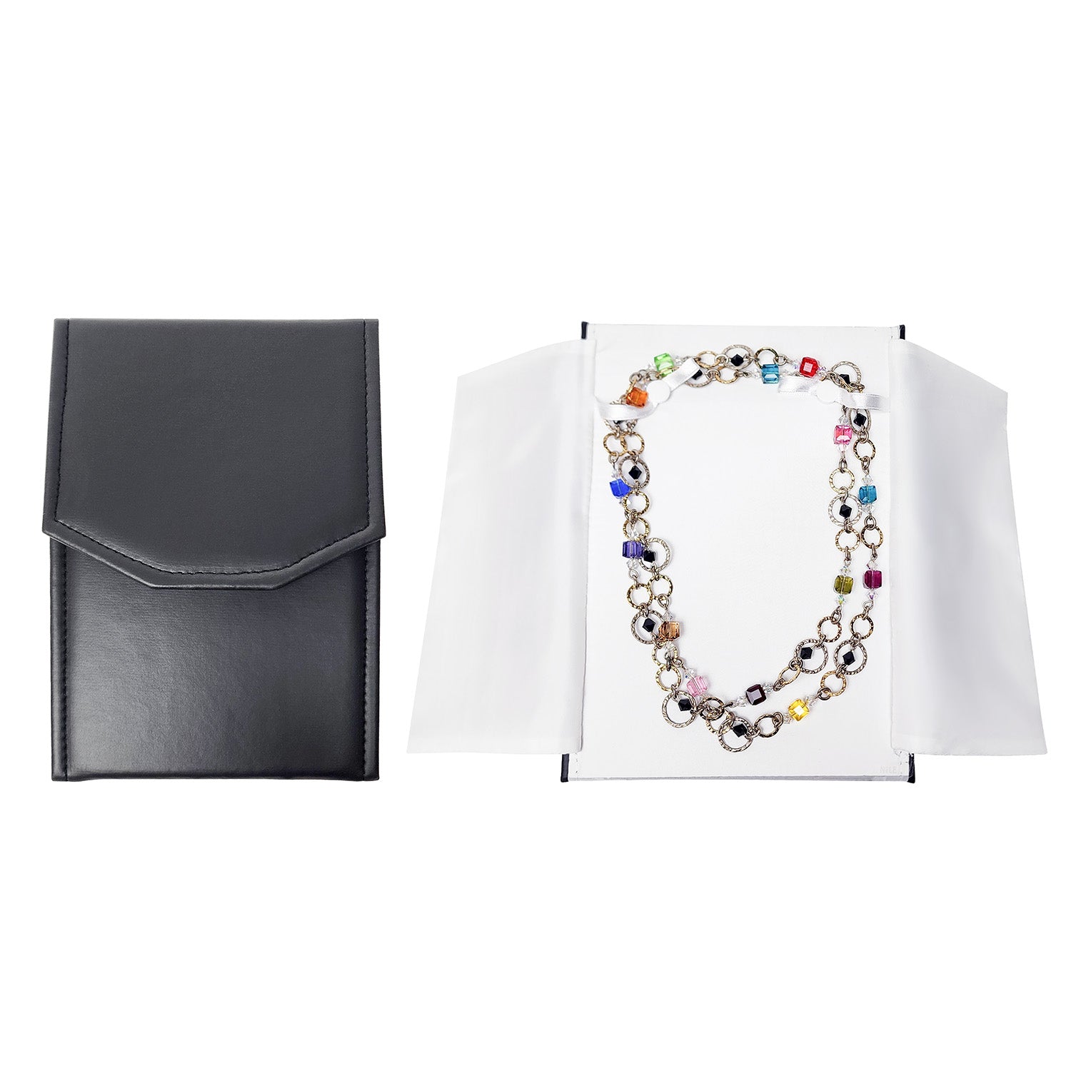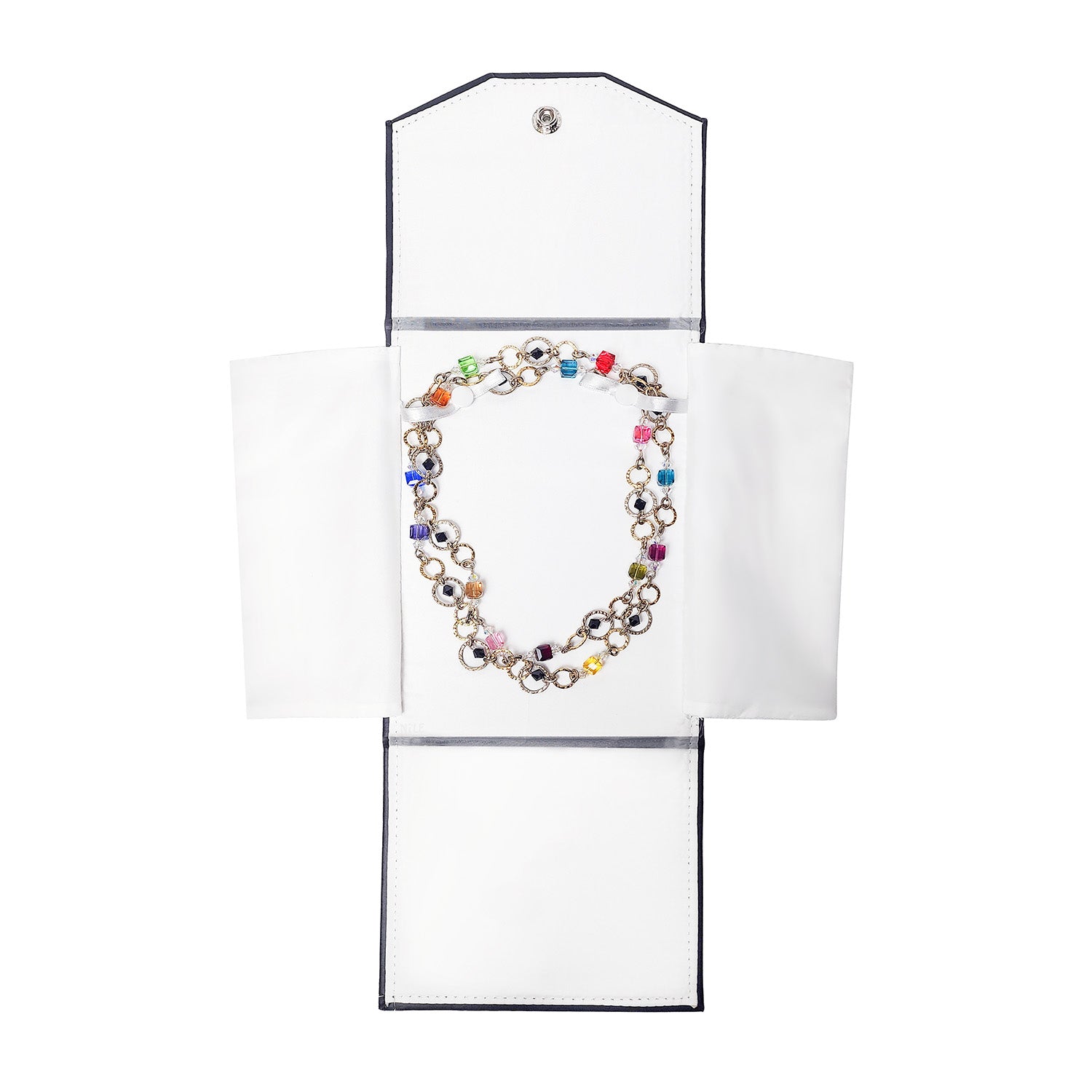 - LEATHERETTE NECKLACE FOLDER - It has two snap-on loops and two pieces of webbing on both left and right sides to store your jewelry safely