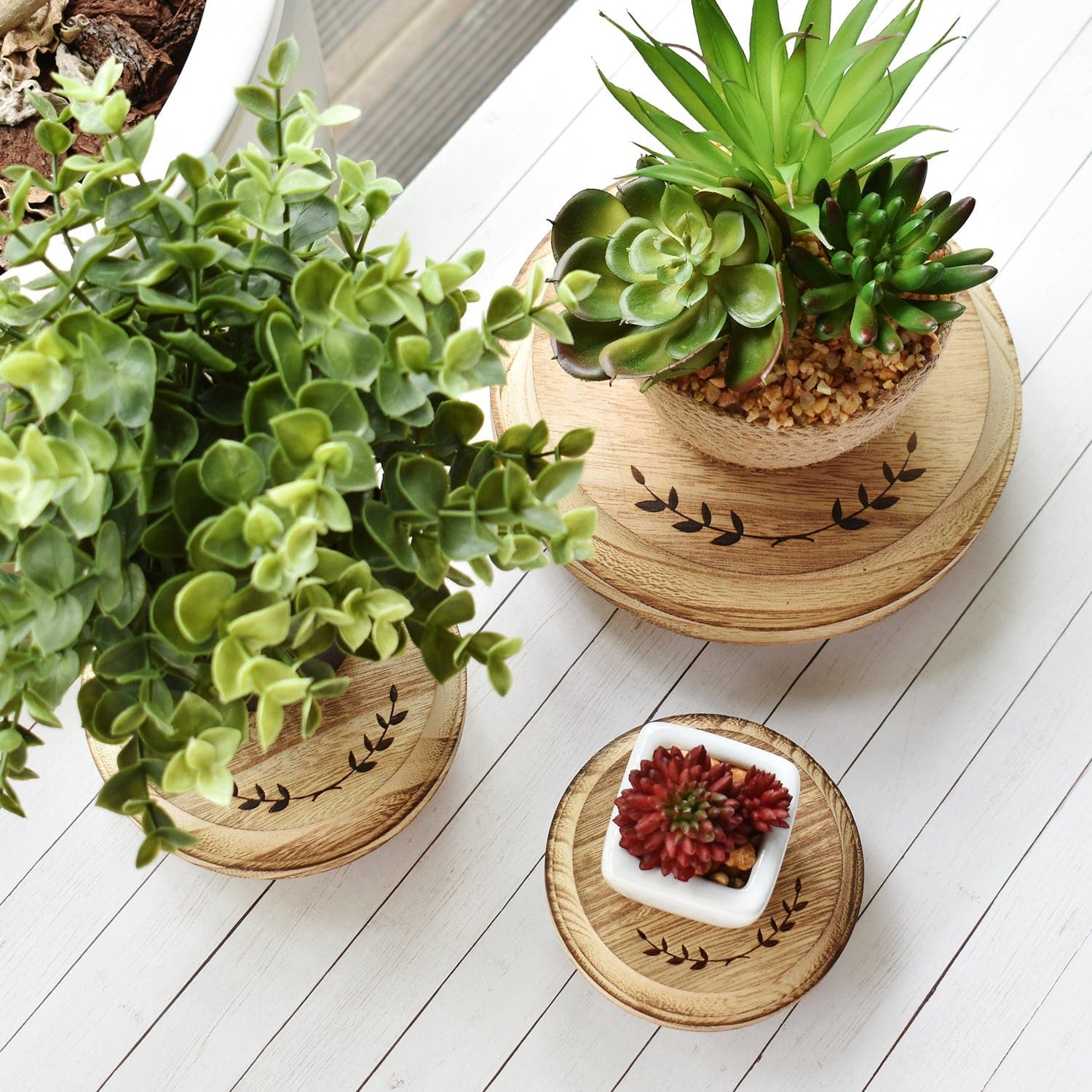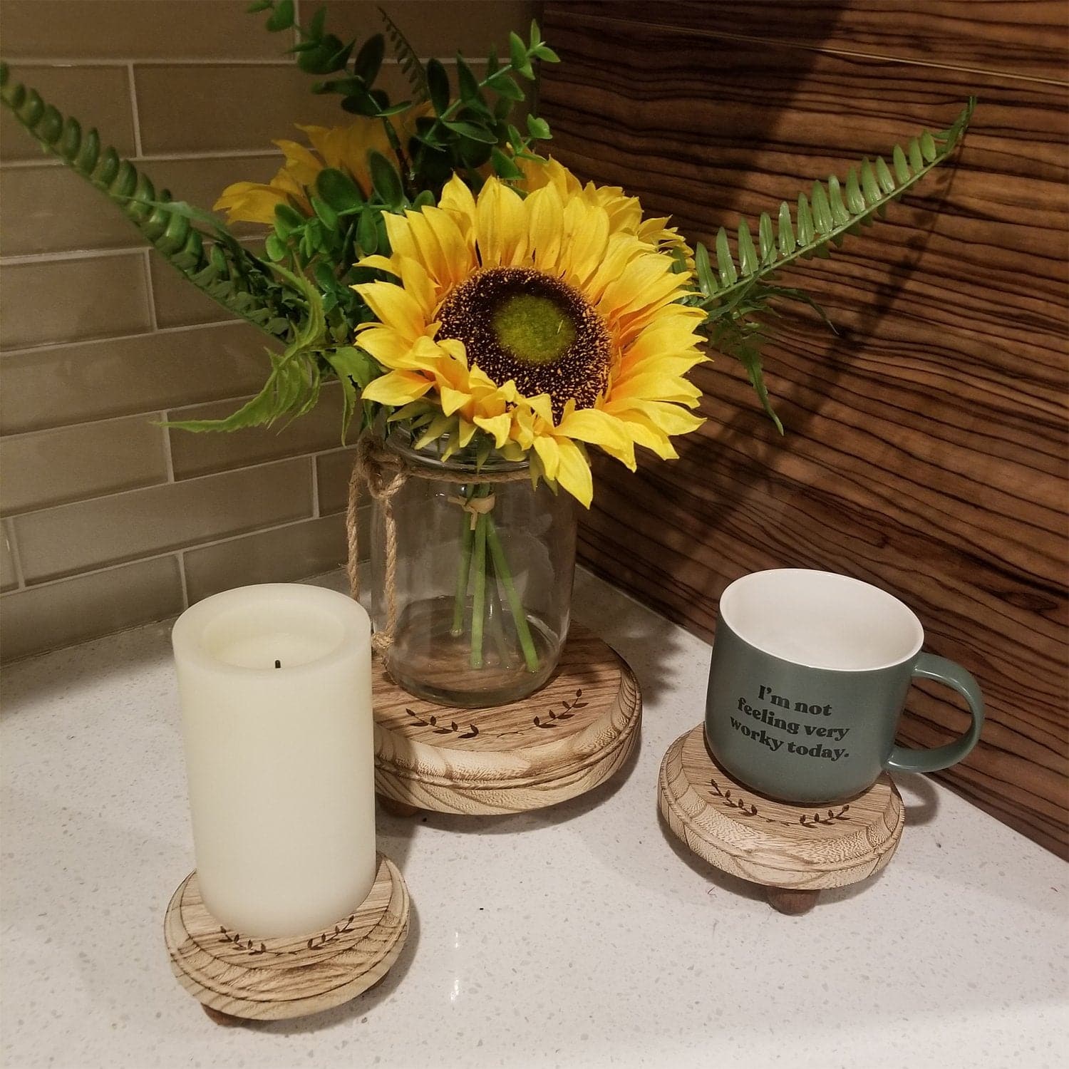 Stackable heat-stamp designed wooden display riser stands in 3 different sizes designed to organize and display jewelry, candles, cups, vases, figurines, etc.